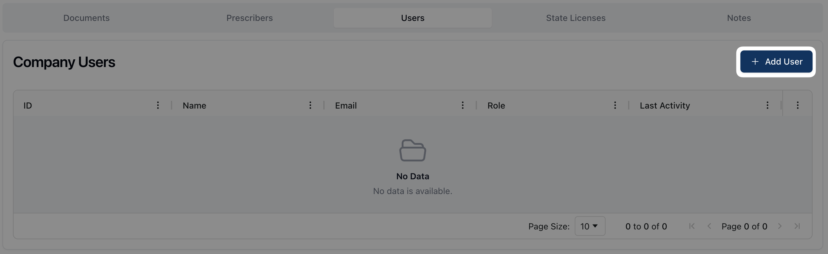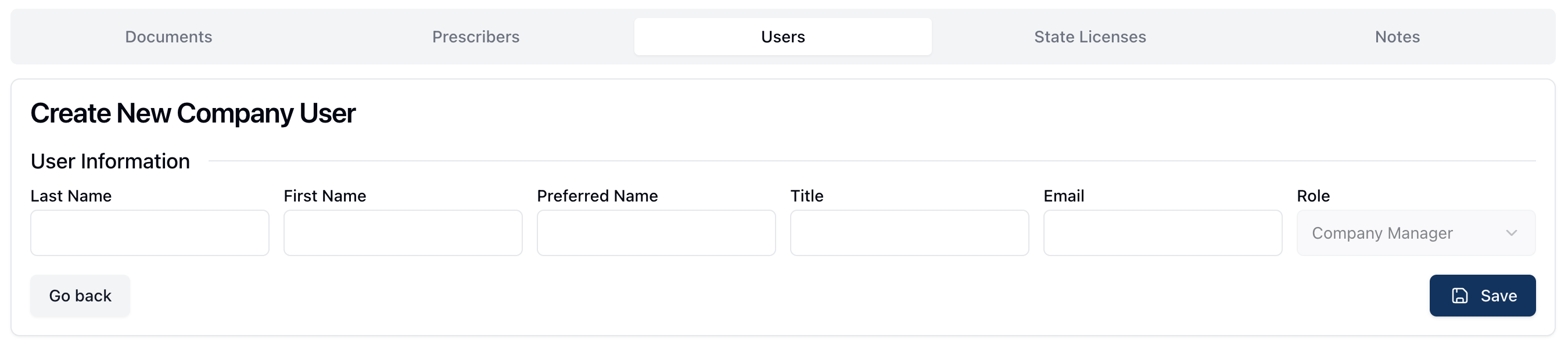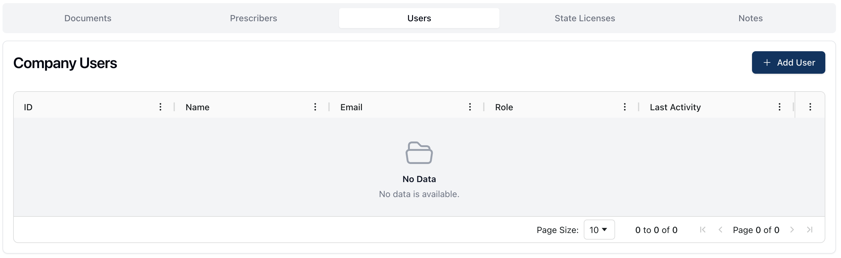 The Users tab displays all users related to the company, not including prescribers, with access to the system. This may include users such as the primary contact or company manager.