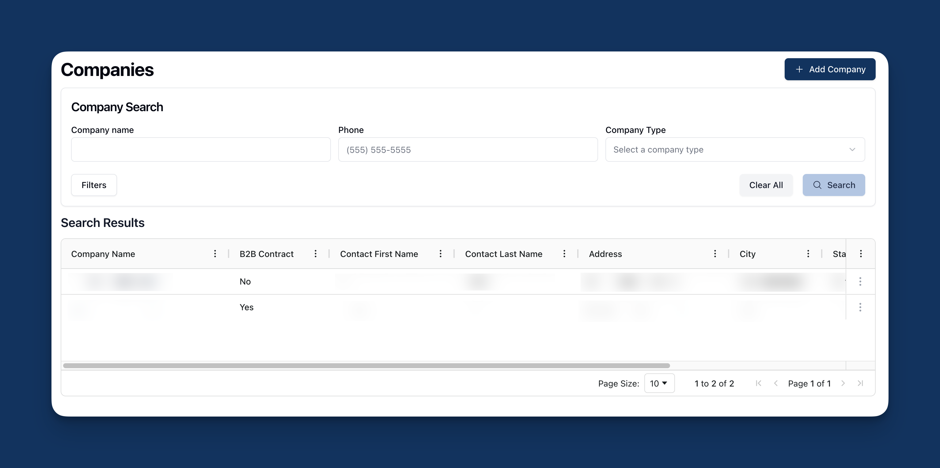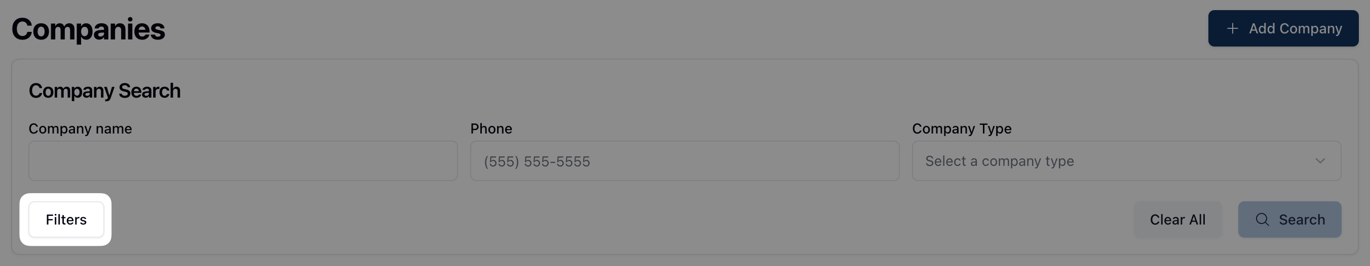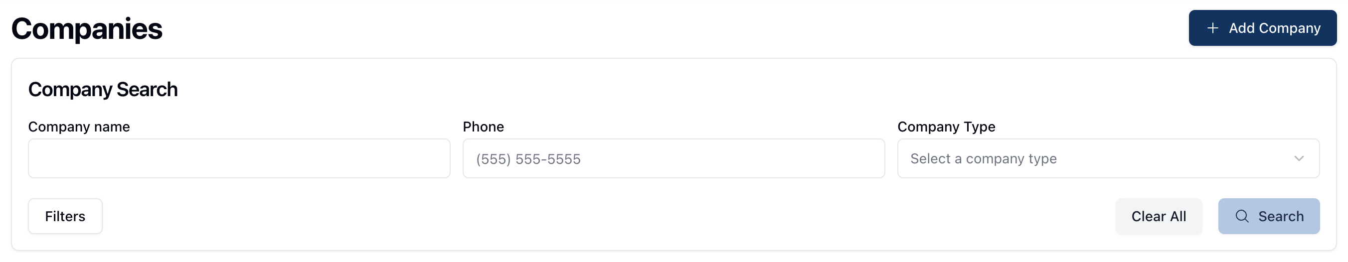 Under Company Search, you can search for a company by the Company Name, Phone, or Company Type. Once you've entered the relevant search terms, click the Search button in the lower right corner to filter the results that appear in the table below.