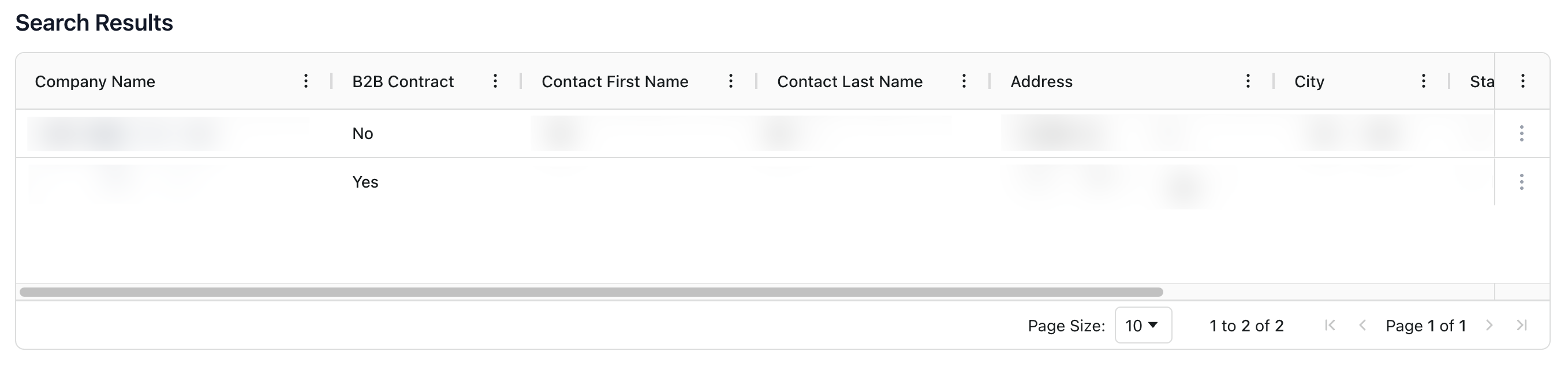 To visit a company's profile, click the underlined Company Name from the search results list. On the company record, you can find the company name, contract type (B2B or direct), and the primary contact's name.