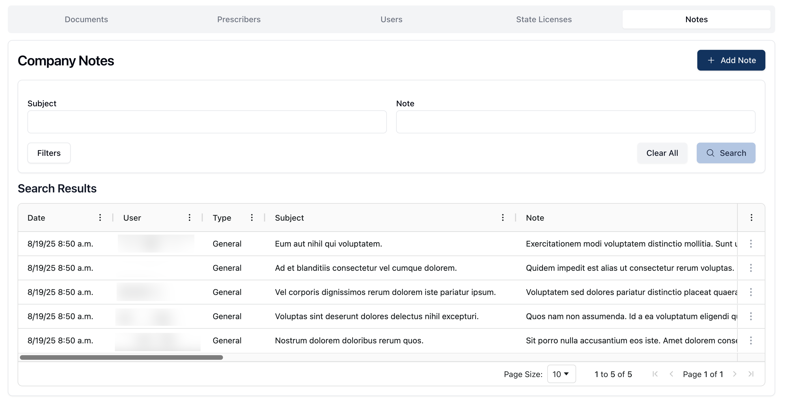 Using the search fields at the top of the page, you can filter the search results by the subject line of the note or the content of the note itself, using the Subject and Note fields respectively. Once you've entered the relevant search terms, click Search to filter the results below.