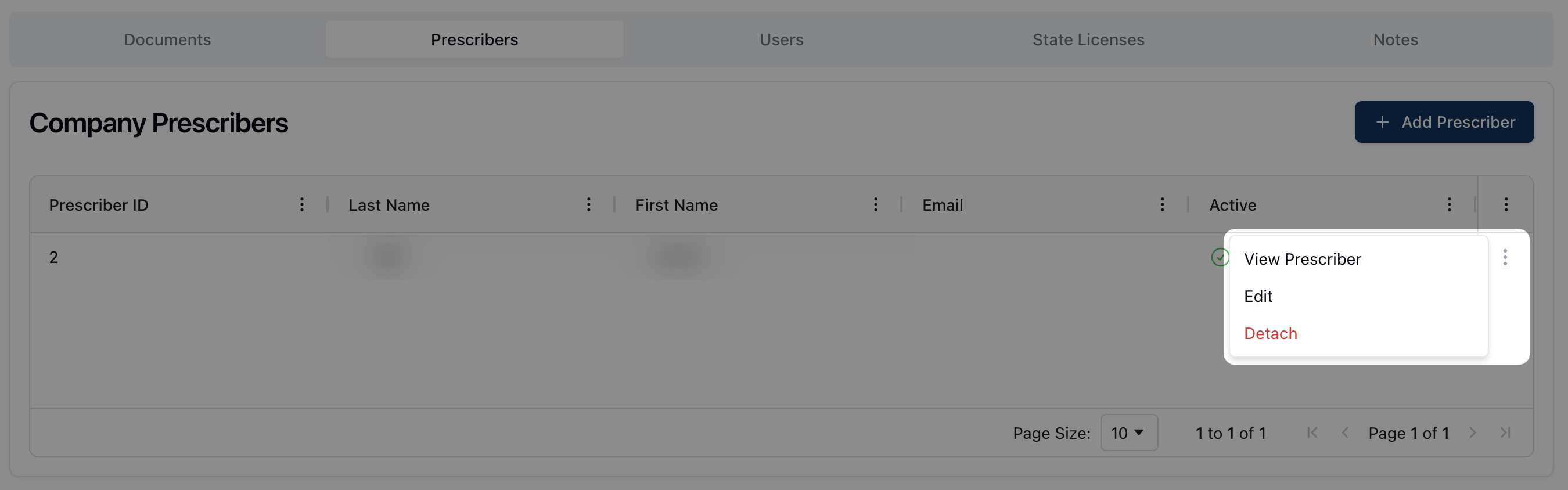 This menu also includes the option to Edit the prescriber record and Detach the prescriber from the company.