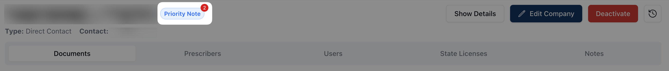 For companies with a priority note attached to the record, a badge appears next to the company name, indicating the quantity of priority notes attached. Clicking the Priority Note icon loads the Notes tab with an applied filter to display only priority notes in the Search Results table.