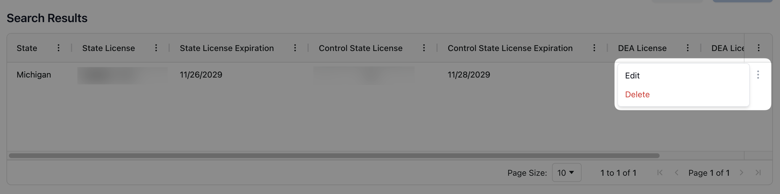 Clicking the actions menu ( ⠇) to the right of each state license allows you to Edit or Delete the related state license from the company record.