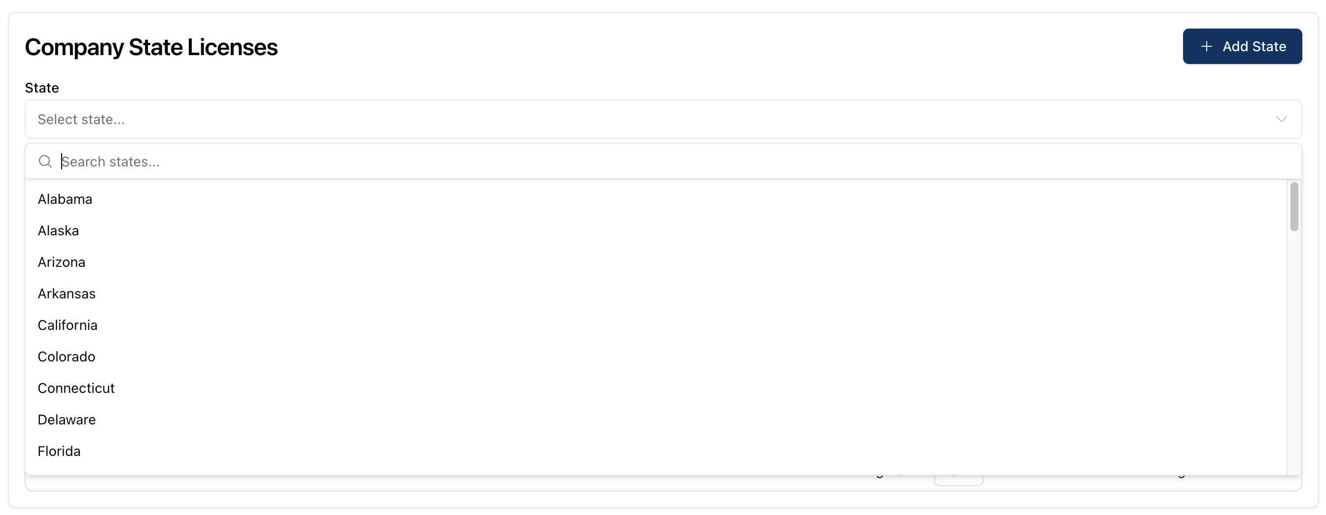 On the Company State Licenses form, select the state for which you are adding licenses from the dropdown below State Information. You can either scroll to select the appropriate state or begin typing the state into the search field at the top of the dropdown to filter the results below.