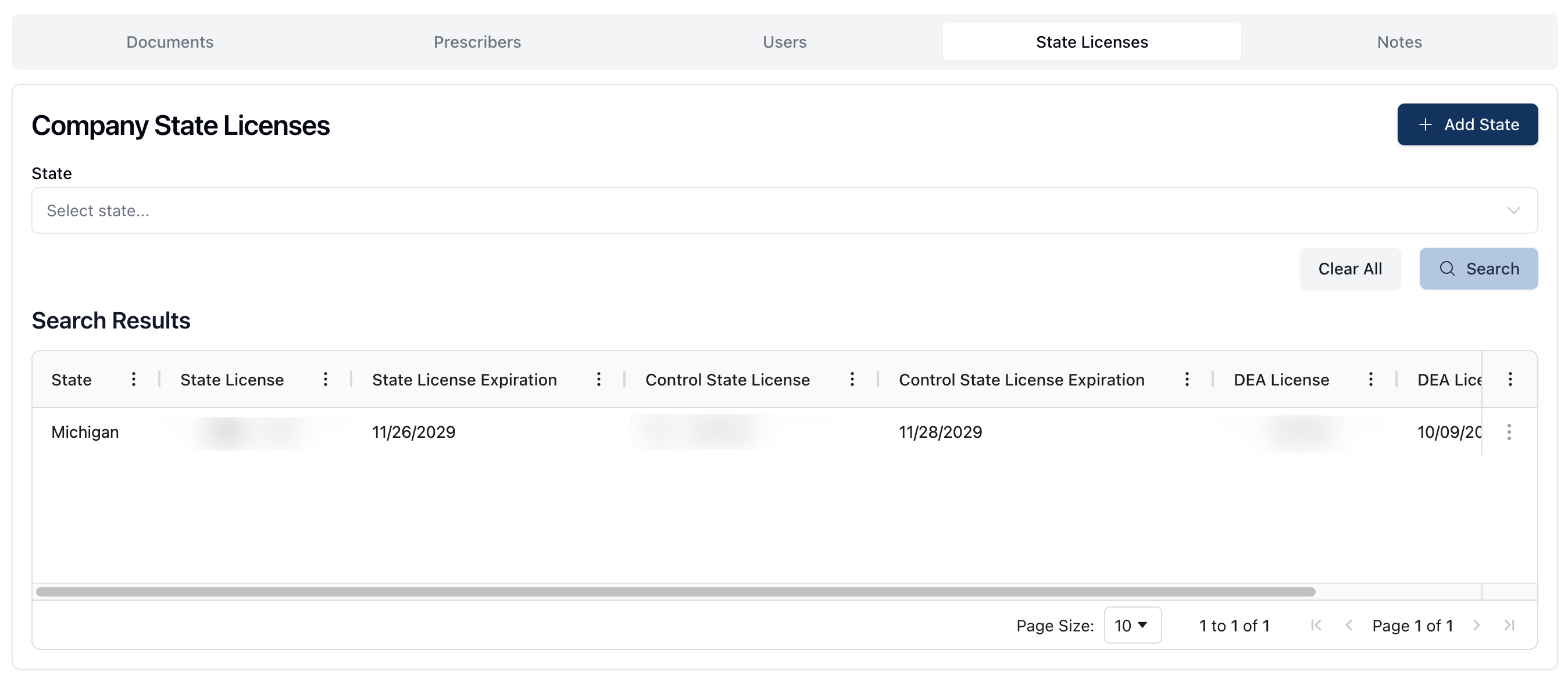 The State Licenses tab displays all state licenses related to the company. Each license displayed in the Search Results table includes the following: