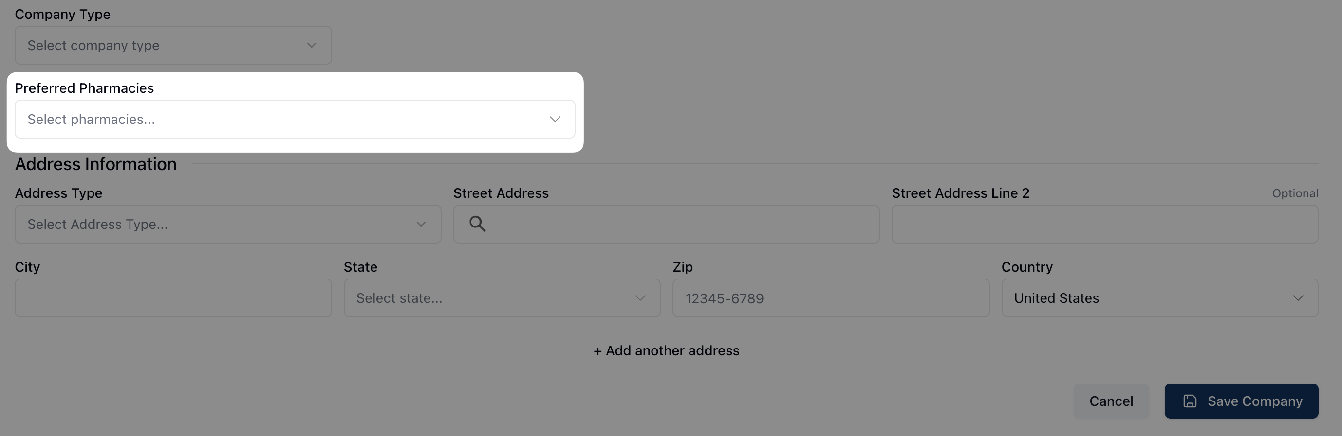 Preferred Pharmacies allows you to select the company's preferred pharmacies from the dropdown menu. Note that it's possible to include more than one pharmacy in this field.