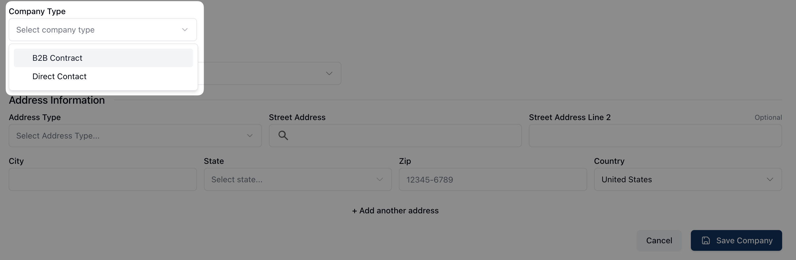 Under Company Type, select either B2B Contract or Direct Contact from the dropdown menu options.