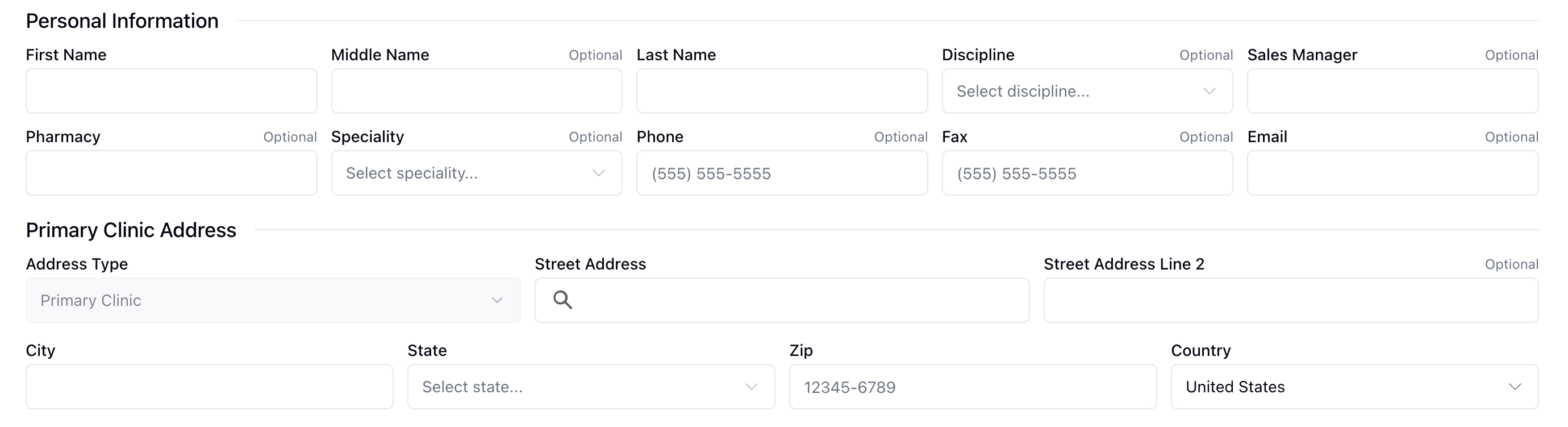 Once you select the prescriber, the prescriber's Personal Information and Primary Clinic Address will autofill in the fields below. You can then review the pre-populated fields to confirm the information entered.