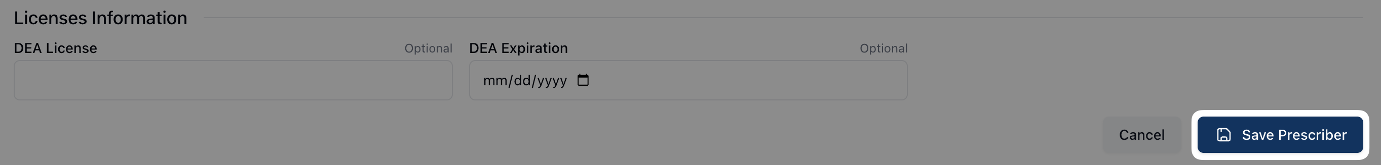 Under Licenses Information, enter the prescriber's DEA License and DEA Expiration. Once complete, click Save Prescriber to add them prescriber to the company record.