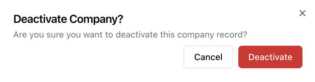Clicking this button opens a popup asking you to confirm the deactivation. If you’d like to deactivate the company record, click Deactivate once more to confirm the action. If you clicked Deactivate in error, selecting Cancel returns you to the previous page.