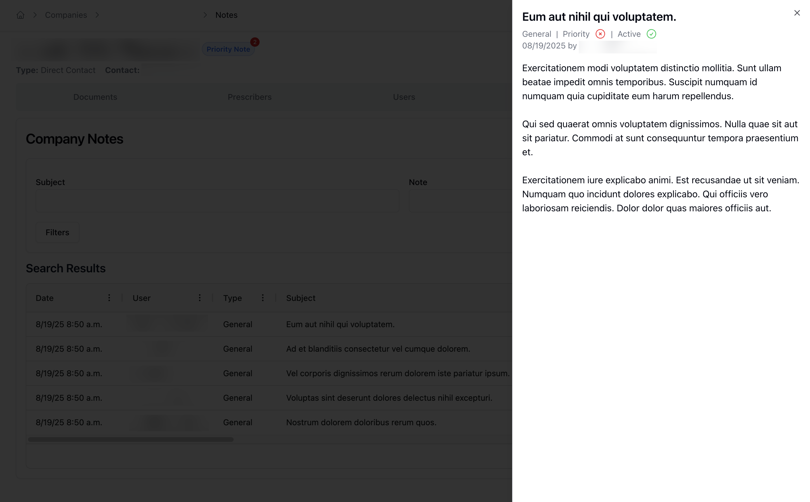 Clicking the actions menu ( ⠇) to the right of each note allows you to View the note, opening the note in a dynamic sidebar on the page. This view includes: