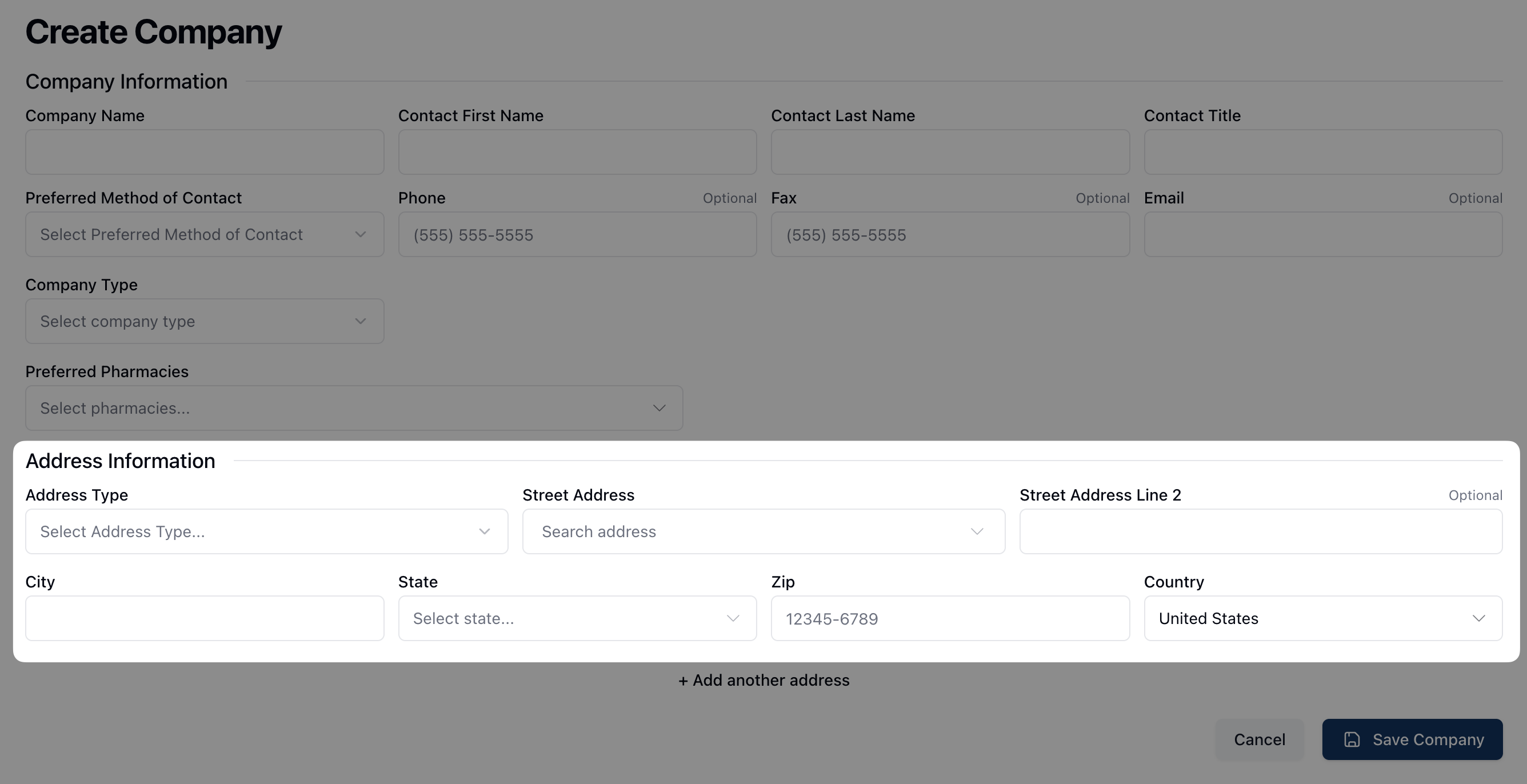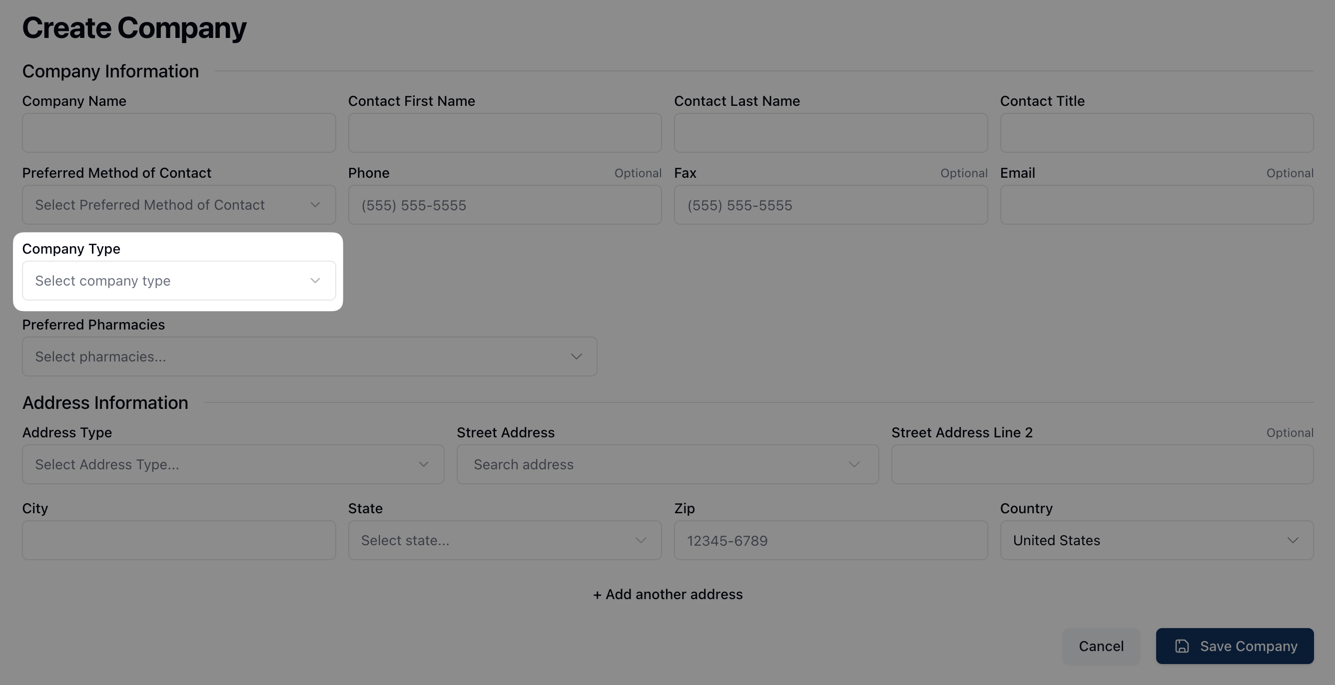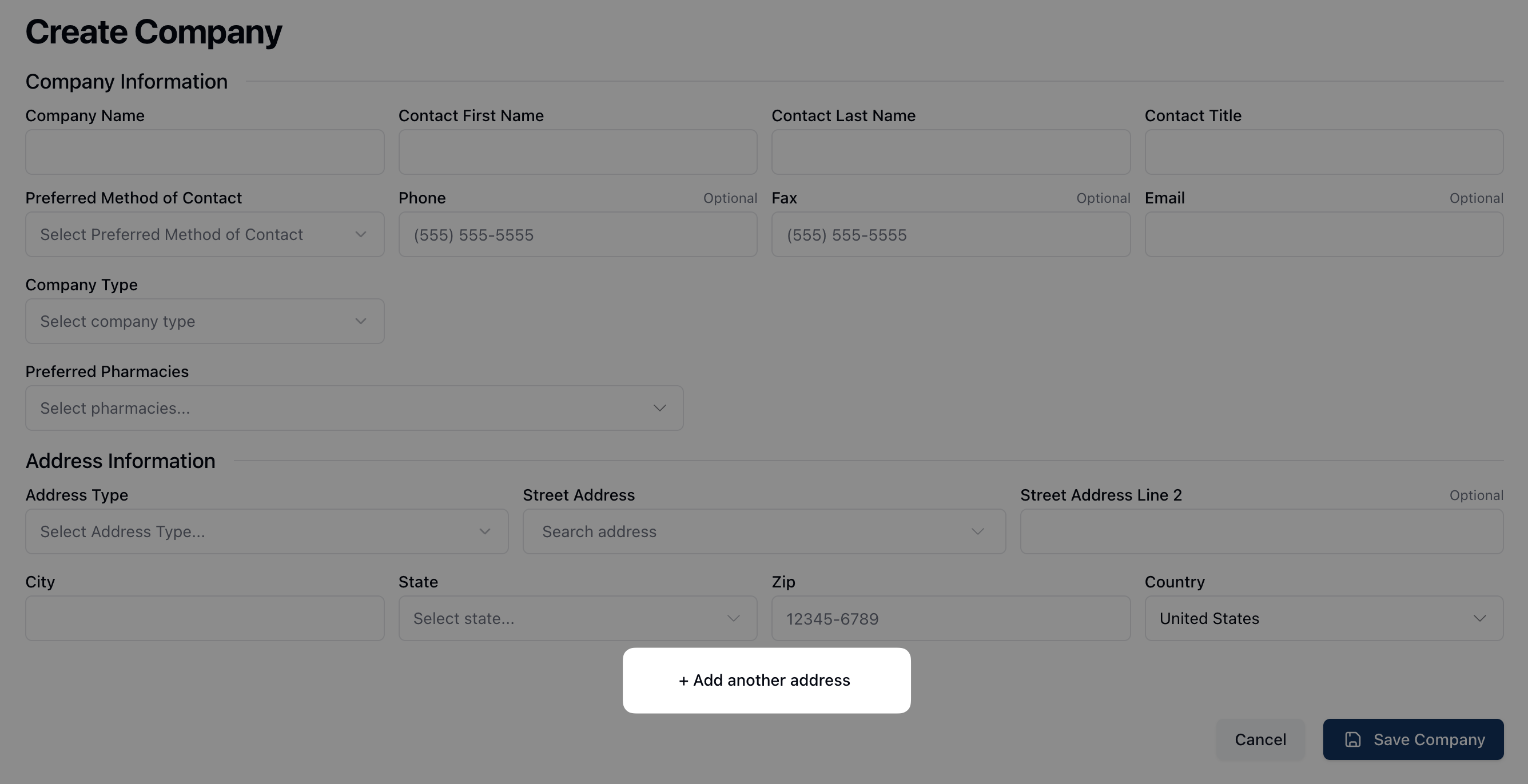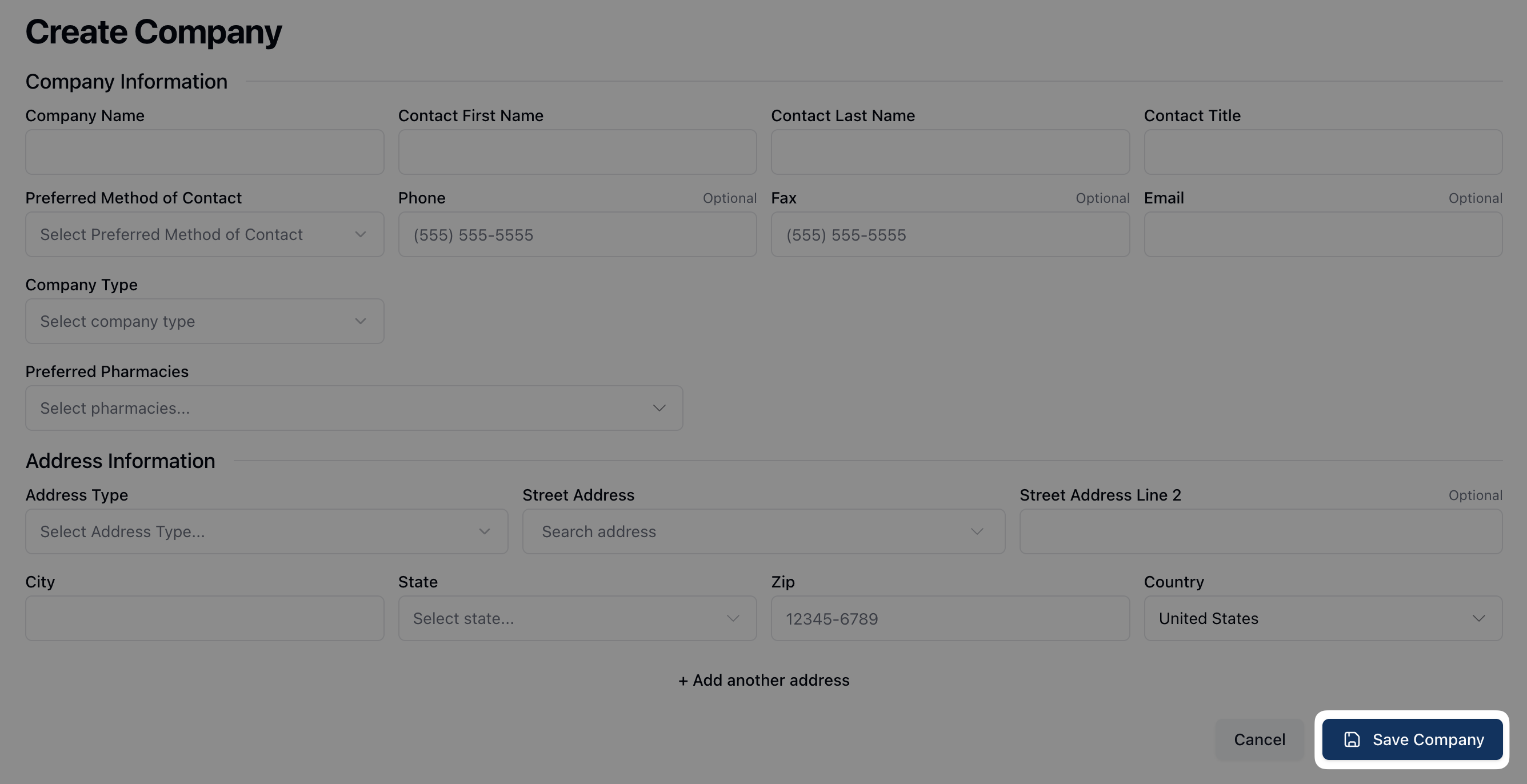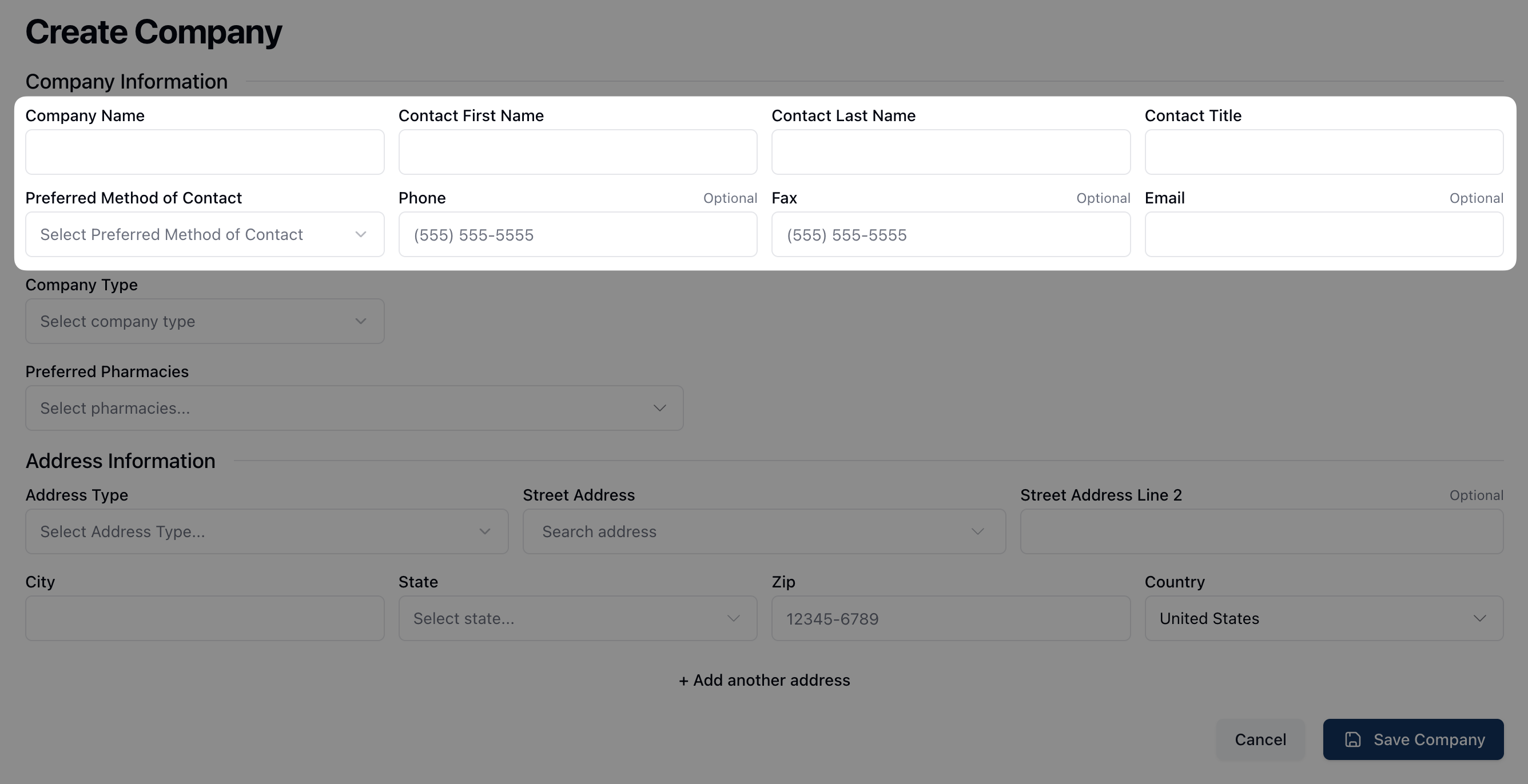On the Create Company form, begin by filling out the company information, including the company name and relevant point of contact.