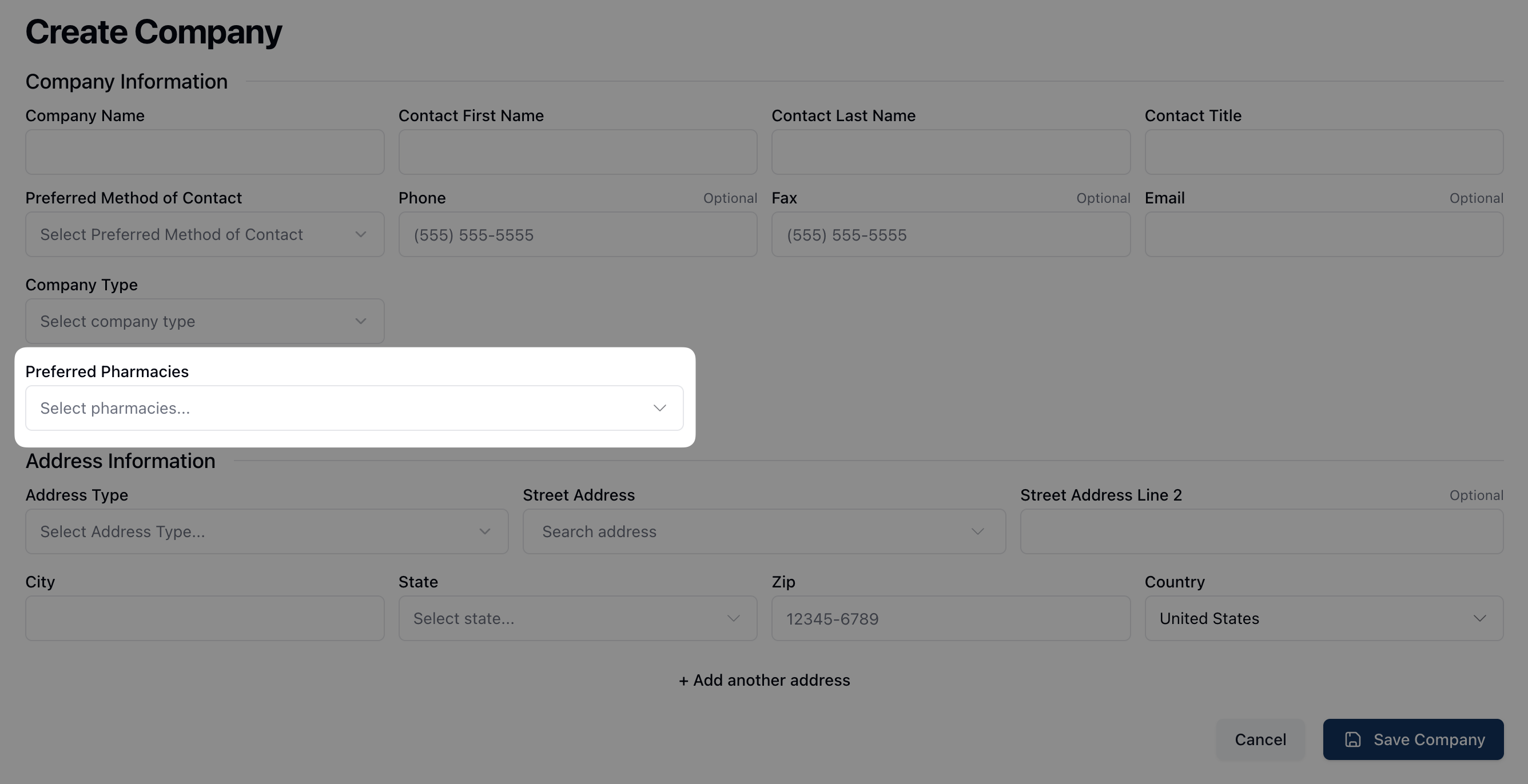 Under Preferred Pharmacies, select the company's preferred pharmacies. Note that it's possible to select more than one pharmacy.