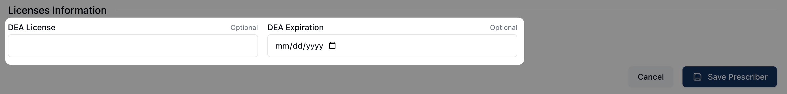 Add the prescriber's DEA License information, following the relevant format displayed in the field.