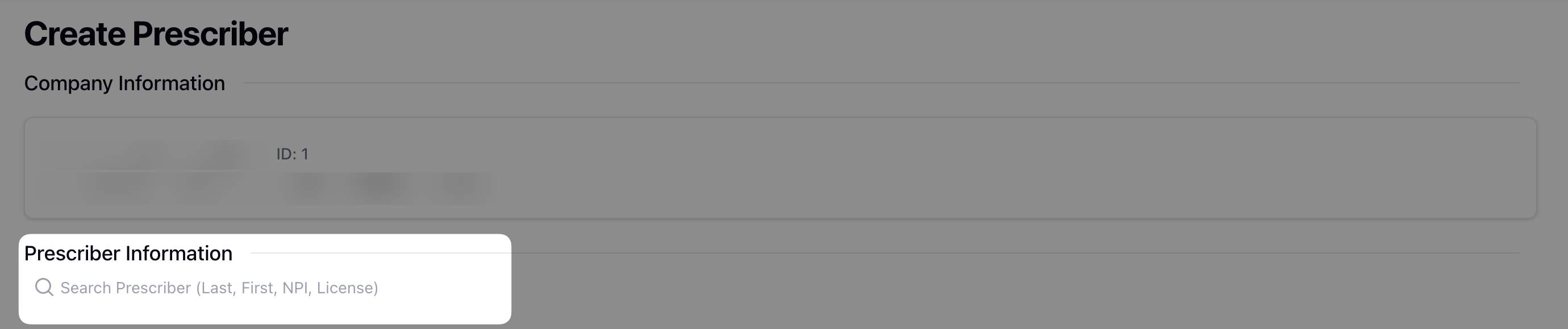 If the prescriber already exists in the system, enter their name, NPI number, or license number in the search field below Prescriber Information. Select the relevant prescriber to automatically fill the form fields below.