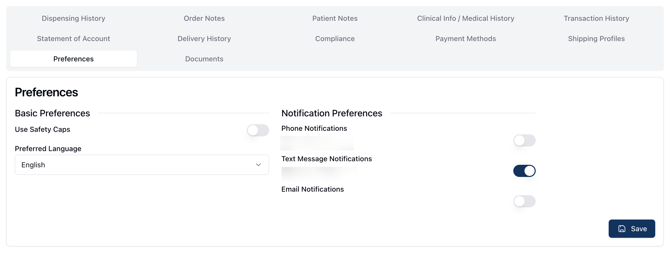 This includes Basic Preferences, such as the patient's preference for using safety caps and their preferred language.