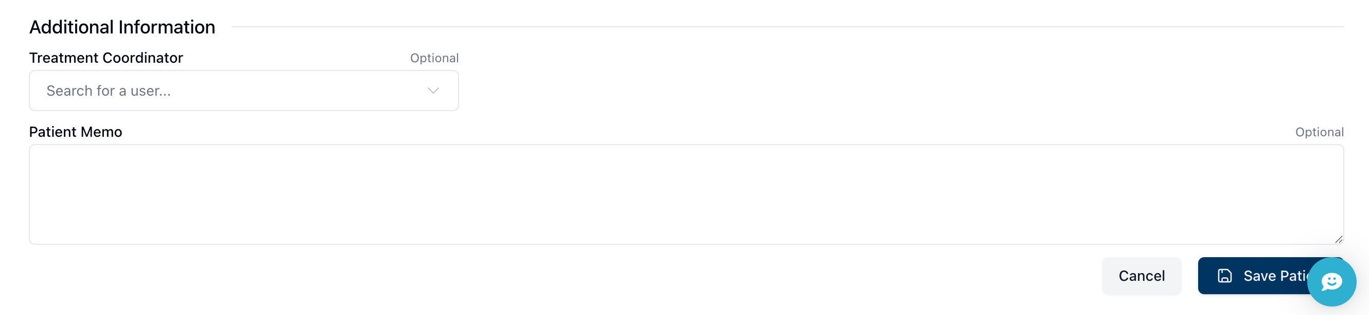 At the very bottom of the form are two optional fields: Treatment Coordinator and Patient Memo. These fields retain information about the patient's treatment team and any other relevant information you may wish to add to the profile.