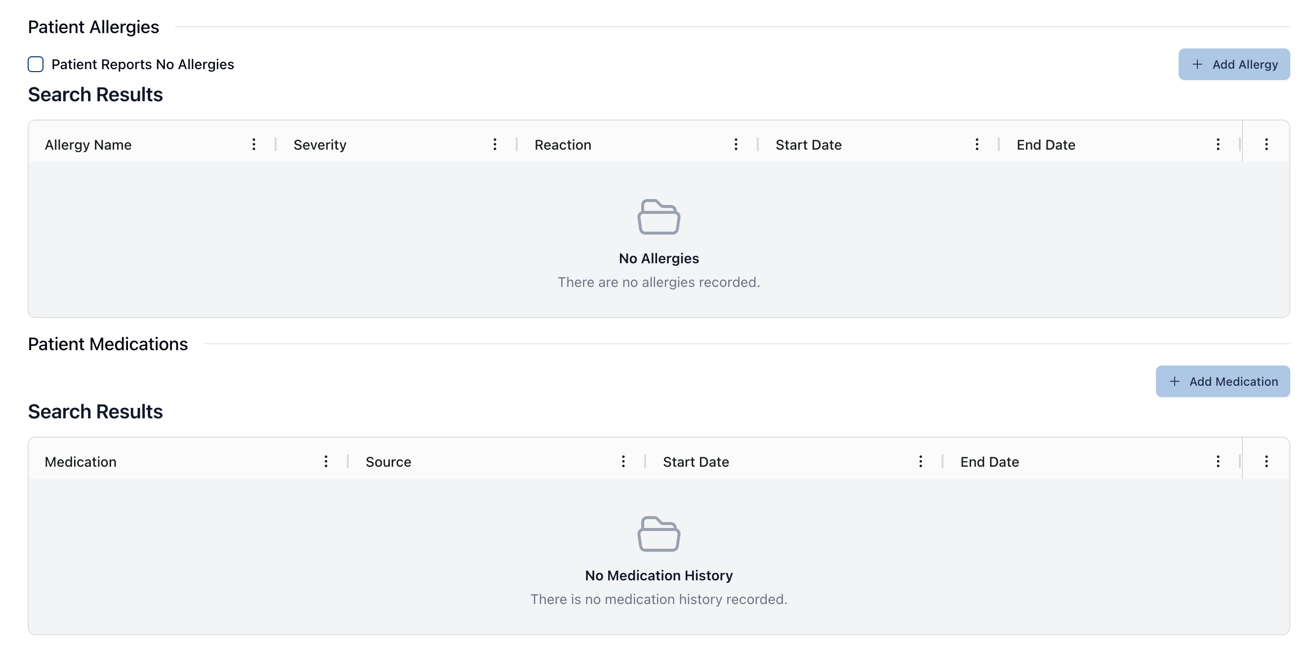 Once added, the related tables display any patient allergies and/or medications, which you can then edit or modify using the actions menu ( ⠇).