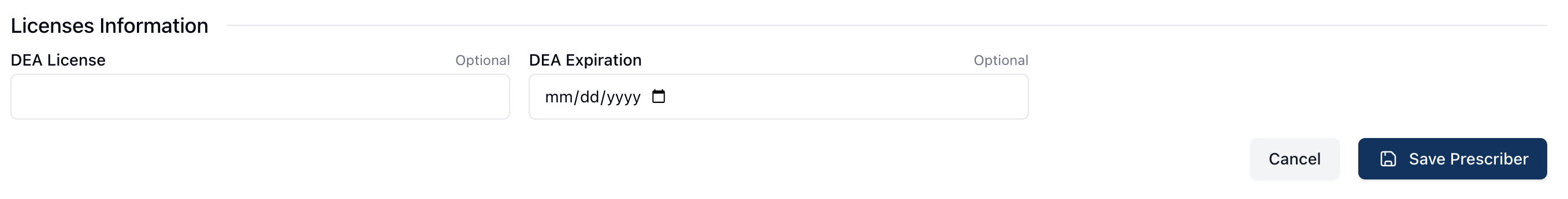 Add the prescriber's DEA License Information following the standard format(s), displayed in the DEA License field.