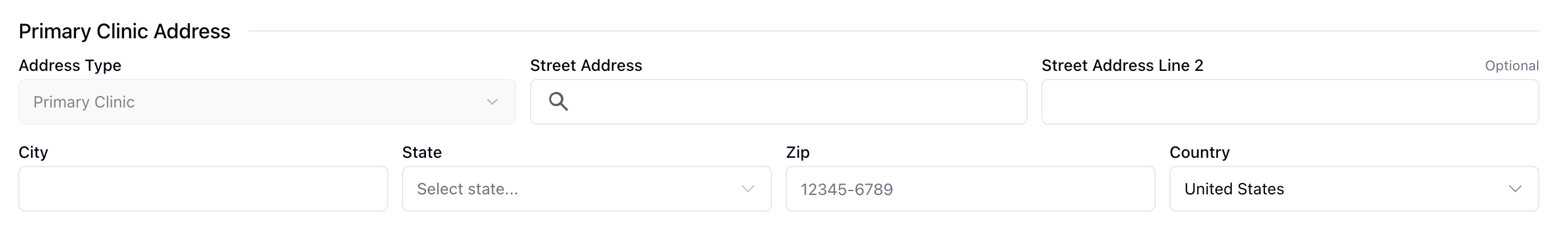 Add the prescriber's Primary Clinic Address. Note that entering the street address into the related field provides a dropdown menu to assist in autocompleting the address.